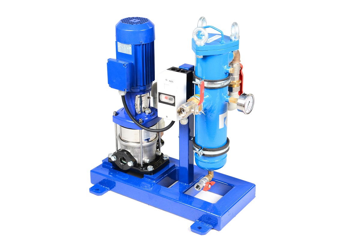 Automatická filtrační stanice s čerpadlem DPV 4/4 a filtrem Rosedale sloužící k filtrování procesní kapaliny, která je v nádrži pro kontrolu těsnosti plastových výlisků.