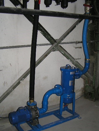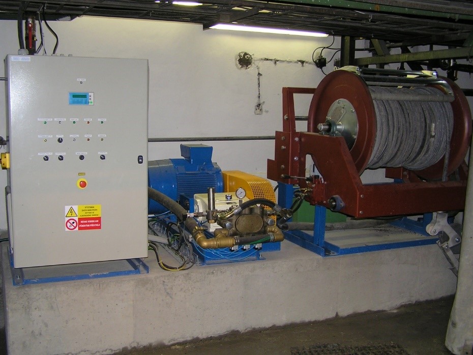 Vysokotlaké čistění technologického potrubí výrobní linky vláknocementové střešní krytiny a jincýh stavebních hmot. Montáž vysokotlakého čistícího agregátu je přizpůsobena pro vnitřní použití, kdy pohon vysokotlakého čerpadla AQM zajišťuje elektromotor. Průtok a tlak může obsluha jednoduše regulovat pomocí frekvenčního měniče. Vysokotlaký čistič je tak možné použít pro čistění vnitřního povrchu potrubí od inkrustů a usazenin stavební hmoty nebo po snížení průtoku a zvýšení tlaku připevnění vysokotlaké pistole k čistění vnějších povrchů.