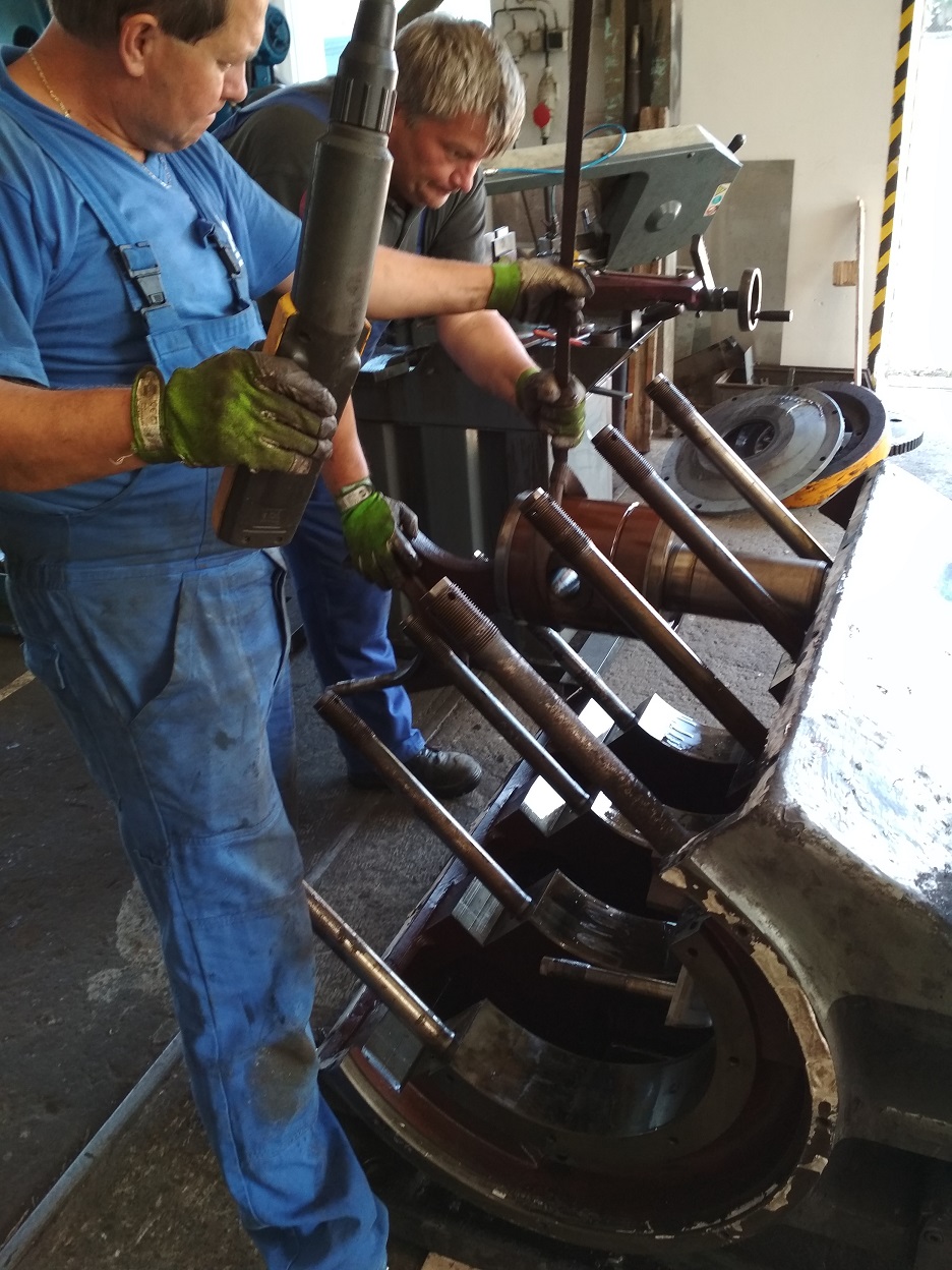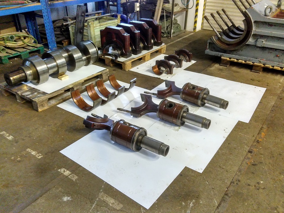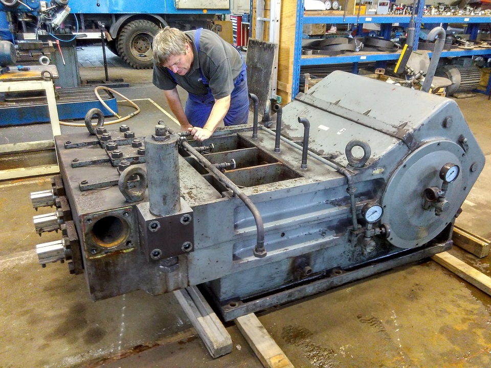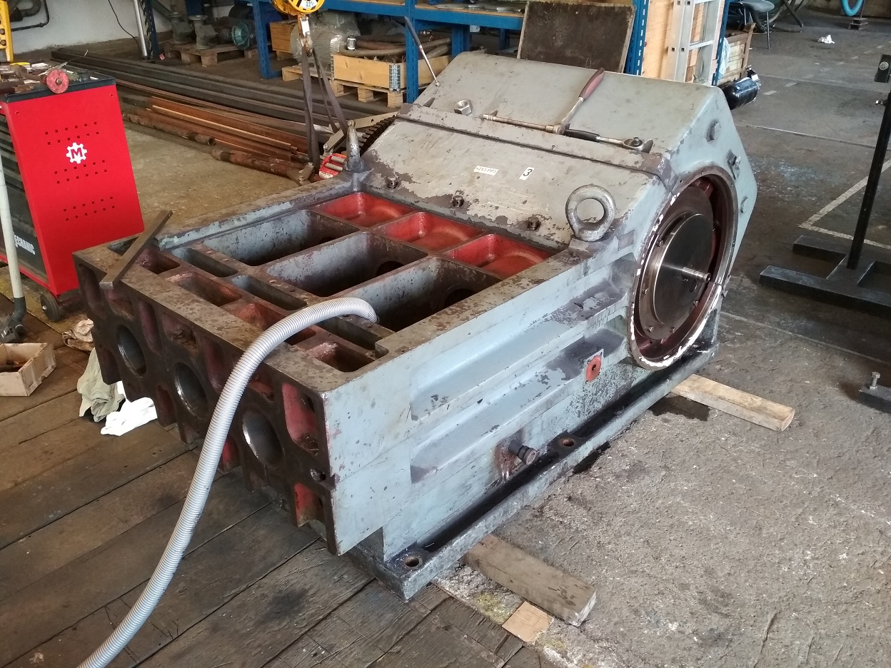 Kompletní oprava vysokotlakého plunžrového čerpadla SIGMA, s technickým označením PAH 3-140-85 s hmotností 5.400 kg, průtokem 650 l/min a tlakem 200 bar, které je používáno pro ostřik okují v železárně déle jak 30 let.