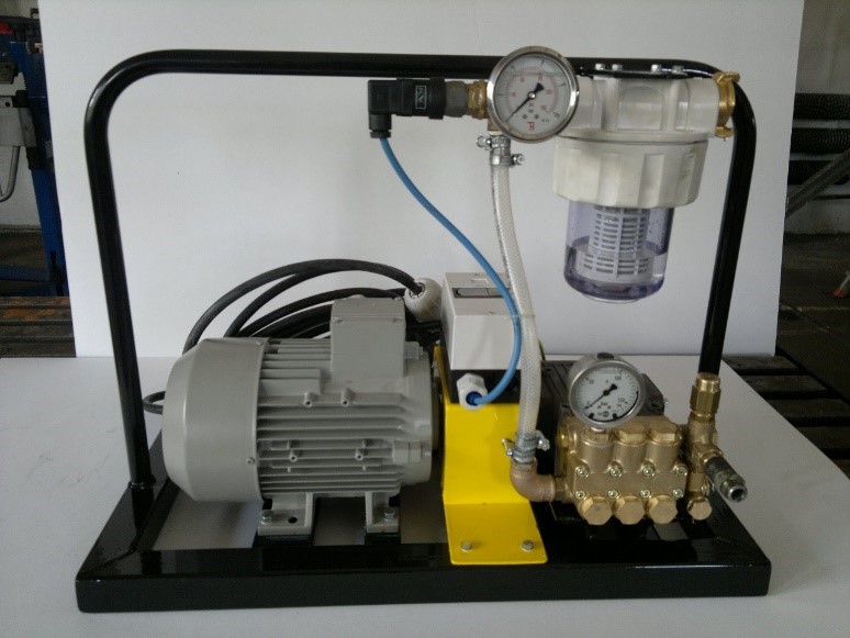 Malé tlakovací zařízení s výkonem 0,75 kW určeno pro tlakové zkoušky akumulačních nádrží, tlakových nádob, odlitků, armatur, fitinků apod.