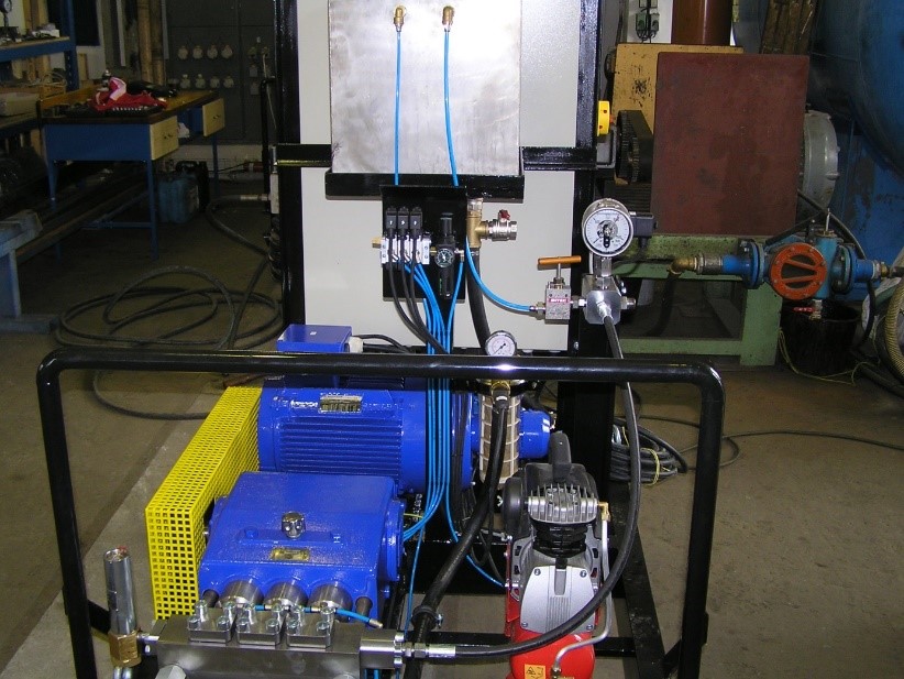Mobilní tlakovací agregát s elektromotorem a frekvenčním měničem, který slouží k tlakování trubkovnic kotlů pro elektrárny. Automatické pneumatické vypínaní jednotlivých ventilů v kombinaci se změnou otáček zajišťuje pracovní tlak v závislosti na zadané křivce tlakování. Dále je agregát osazen kompresorem, podávacím čerpadlem Ebara, nerezová zásobní nádrž. Celé zařízení je umístěno na rámu osazeném pojezdovými koly pro usnadnění manipulace.