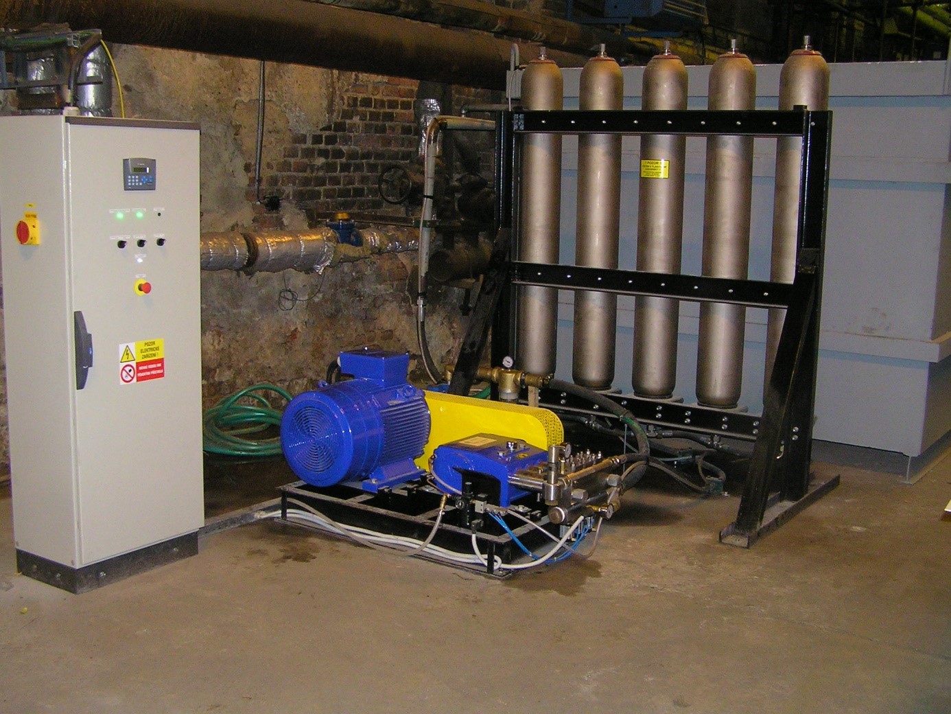 Návrh, výroba a montáž kompletního vysokotlakého systému pro pohánění hydraulických lisů, zakružovaček a ohýbaček v metalurgicko-strojírenské výrobě. Srdcem systému je vysokotlaké čerpadlo AQL 50, které je zdrojem vysokého tlaku vody, která je přiváděna do hydraulického systému. Automatický systém řízení pak zabezpečuje udržení potřebného tlaku v předepsaném rozpětí a to zejména pomocí sady speciálních hydro-pneumatických akumulátorů.