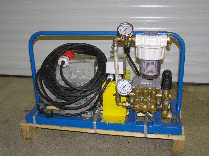Menší vysokotlaký agregát určen k tlakování výrobků, odlitků, potrubních systémů, tlakových nádob, výměníků, tlakových láhví apod.